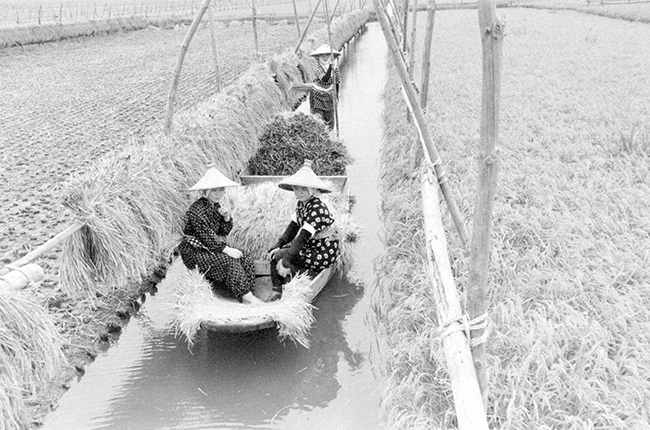 稲を小舟で運搬する水郷地帯の稲刈り(1958年)