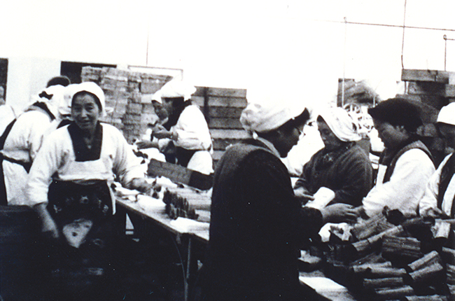 このころになると、配達にはバイクが使われるようになり、納豆を積んだリヤカーを引いて得意先を回りました。家族的雰囲気は昔のままで、高野商店には常時2人ほどの従業員兼お手伝いさんが住み込んでおり、彼女たちは徳三を「旦那さん」、なをを「女将さん」と呼んで親のように慕い、徳三たちも正月には桐の柾目の下駄などを贈ってかわいがっていました。当時、納豆作りの主役は女性たちで、女将さんは和服にたすき掛けのいで立ちで陣頭指揮をとっていました。