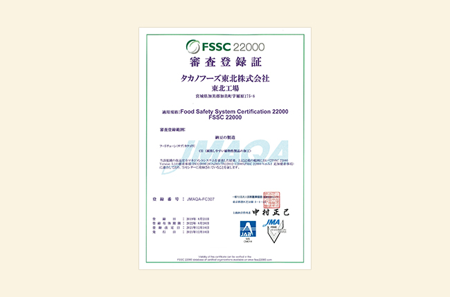 さらに企業ブランドのイメージ向上とともに、食の安全・安心を求める取引先および消費者から信頼を得ることができるよう、生産現場のリスクマネジメント体制の構築を目的にFSSC22000の認証取得に着手しました。FSSC22000はHACCPのみならずISO9001をも一部内包する食品安全マネジメントの国際規格です。当社グループでは平成30年10月の伊勢工場を皮切りに、同年11月水戸第一工場および第二工場、令和元年8月東北工場、同年10月ヒナタフーズ㈱、11月岡山工場、令和2年3月㈱井川食品で認証を取得しました。