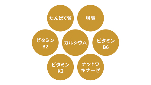 納豆は日本の伝統食品の一つです。主な栄養成分は、たんぱく質、脂質、カルシウム、鉄など大豆とほぼ同じ栄養を含んでいますが、脂質代謝に欠かせないビタミンB2を大豆に比べ多く含んでいるのが特徴です。