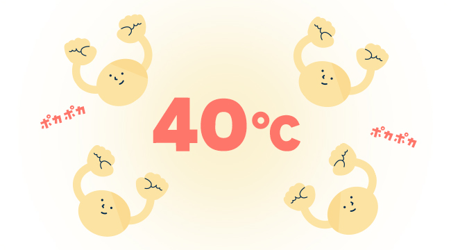 納豆菌(なっとうきん)が大豆の成分を栄養(えいよう)にしてたくさん増(ふ)え、その時に納豆菌(なっとうきん)が作り出した物が、納豆のネバネバになったり、においになったり、おいしさになったりします(このことを発酵(はっこう)といいます)。納豆菌(なっとうきん)が元気に増えて活動するとおいしい納豆ができるのです。そのため、納豆菌(なっとうきん)が活発に活動できる温度である40℃前後に温めています。