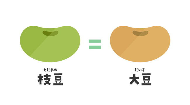 大豆は枝豆(えだまめ)(お父さんたちが夏におつまみに食べている緑の豆です)を夏に収穫(しゅうかく)せずに、そのまま完熟(かんじゅく)させ茶色くなった秋(10月~11月)に収穫(しゅうかく)したものです。 そのため、大豆は茶色になりますが、品種(ひんしゅ)によっては、緑色や黒い大豆もあります。