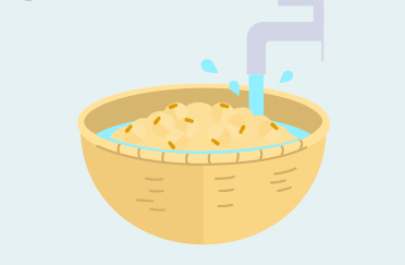 大豆を水洗(みずあら)いして、ごみを取り除(のぞ)きます。