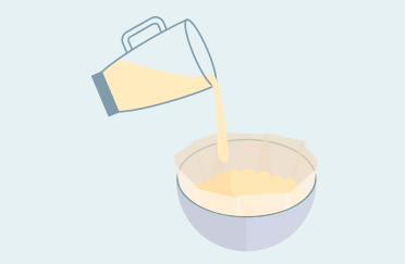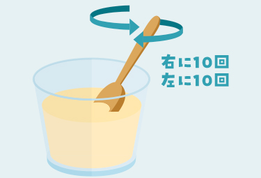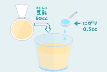 容器(ようき)に冷(ひ)えた豆乳(とうにゅう)と、にがりをいれます。