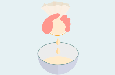 ボウルの中に、細かい穴(あな)のあいたふくろを置(お)いて豆乳(とうにゅう)を受けます。