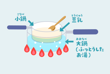 豆乳(とうにゅう)がこげつかないように、おたまでよくかき混(ま)ぜながら約(やく)7分30秒温めます。