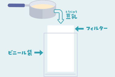 計量(けいりょう)カップなどに、ビニールぶくろ、こまかい穴(あな)のあいたふくろをセットして、小なべで温めた豆乳(とうにゅう)を入れます。やけどに注意してください。