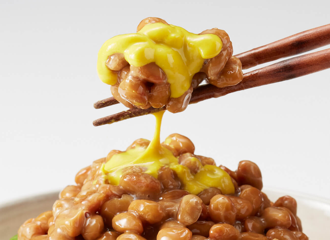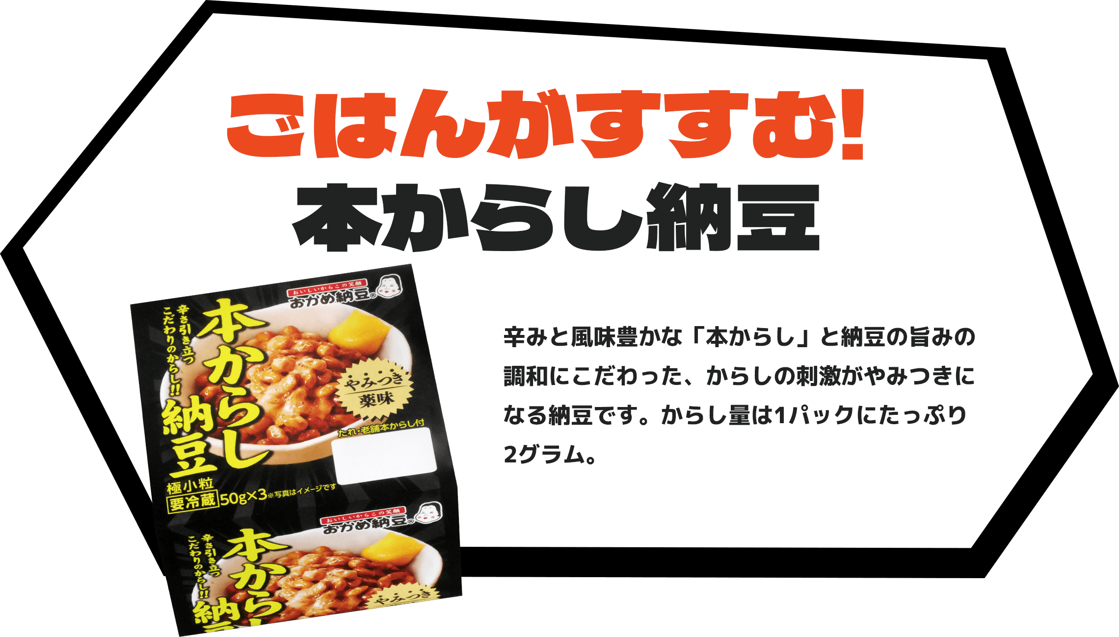 老舗からしメーカーのご協力で商品化できた辛み・風味豊かな「本からし」と納豆の旨みの調和にこだわった、からしの刺激がやみつきになる納豆です。からし量は「極小粒ミニ3」の1.6倍、1パックに2グラム添付しています。