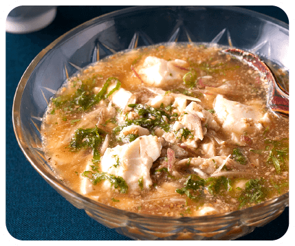 <A>を加えて混ぜ合わせ、豆腐ソースを作る。 - フライパンを中火で熱し、(1)の鶏肉の皮面を下にして皮がカリっとなるようにヘラで抑えながら8割焼く。