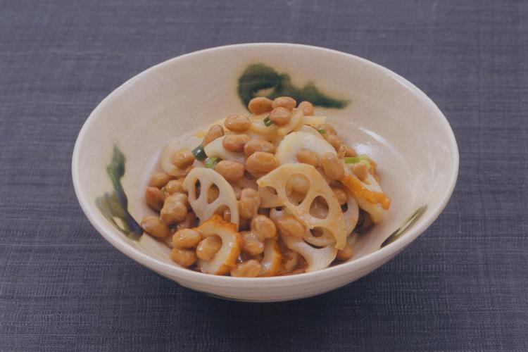ちくわとレンコンの納豆炒め 20分 137kcal ※エネルギーは1人分です。 焼き・炒め 副菜 納豆 材料 (2人分) ちくわ 1本 れんこん 25g 中粒納豆 1パック 納豆のたれ 1袋 ごま油 小さじ1 しょうゆ 小さじ1/2 砂糖 小さじ1/2 万能ねぎ 少々 作り方 ちくわは輪切りにする。れんこんは半月切りにする。 フライパンを熱し、ごま油を入れ、れんこん、ちくわを炒め、納豆のたれとしょうゆ・砂糖で味をととのえる。 2.の火をとめ、中粒納豆と万能ねぎの小口切りを混ぜ、皿に盛りつける。