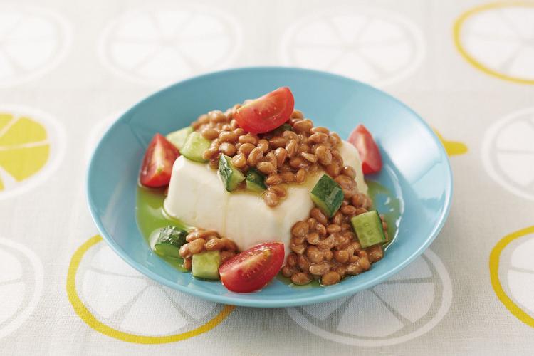 トマトオリーブなっとうふ やっこ 納豆 豆腐 材料 (2人分) 豆腐 2パック(300g) 納豆 2パック 添付のたれ 2袋 ミニトマト 4個 きゅうり 1/4本 EXバージンオリーブオイル 大さじ1 塩 少々 こしょう 少々 作り方 きゅうりは1cm角に切る。ミニトマトは4等分にする。 ボウルに納豆ときゅうりを入れ、納豆のたれ、オリーブオイル、塩、こしょうで味をととのえる。 豆腐を皿に盛りつけ、その上に2をかけ、トマトをのせる。 このレシピにぴったりの商品 絹美人