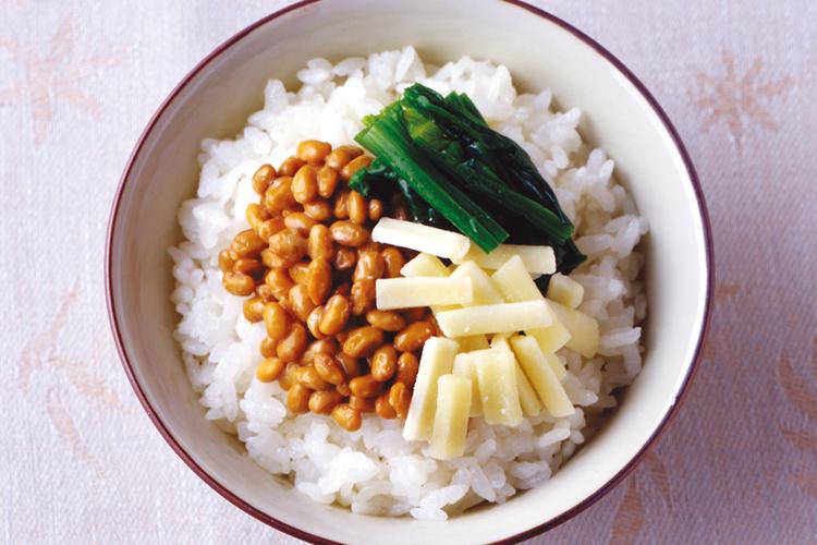 チーズ納豆丼 10分 509kcal ※エネルギーは1人分です。 ご飯もの 納豆 材料 (1人分) 納豆 1パック ほうれん草 1〜2株 チーズ 大さじ2 ごはん 一膳 作り方 ほうれん草は色よくゆで、4cm長さに切る。 丼にごはんをよそい、納豆、ほうれん草、チーズをのせる。
