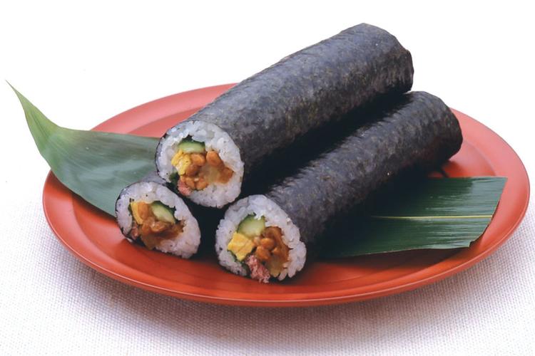 海苔の端を残し、すし飯をのせ、1.〜4.とたれを混ぜた納豆、青しそ、桜でんぶを彩りよく並べ、巻く。