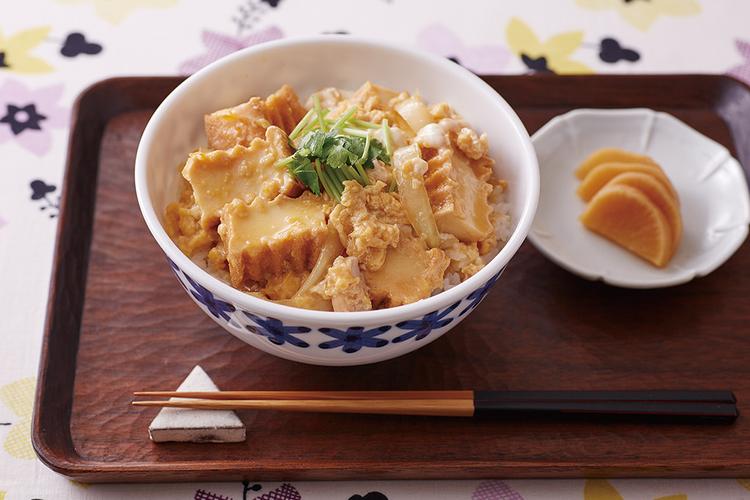 浅い小さいフライパンに煮汁を入れ、玉ねぎと鶏肉を入れ、沸騰させる。あくを取り、厚揚げを入れて、沸騰するまで煮る。