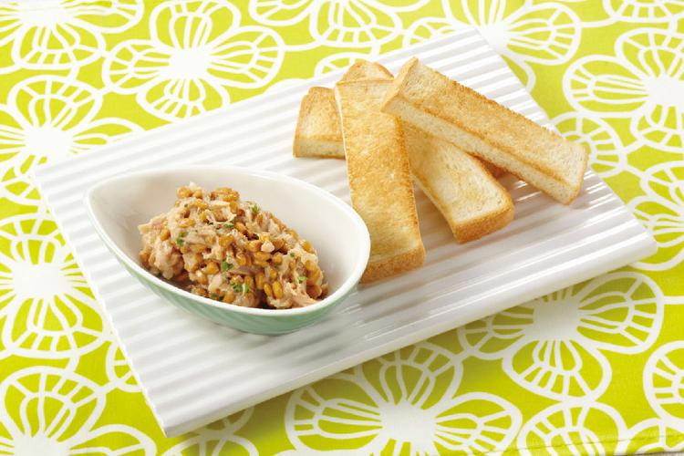 納豆ディップソース 20分 185kcal ※エネルギーは1人分です。 主食(その他) 納豆 材料 (2人分) 食パン(8枚切り) 1枚 納豆 1パック 納豆のたれ 1袋 玉ねぎ 1/4個 ツナ(缶) 1/2缶(40g) パセリのみじん切り 少々 作り方 食パンは4等分に切り、トーストしておく。 玉ねぎはみじん切りにし、さらして辛味をぬき、水を絞る、 ボウルに納豆と納豆のたれを増せ、ツナと玉ねぎを入れてよく混ぜる。 器に3を盛りつけ、パセリを散らし、1を添える。