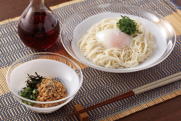 温玉と納豆のピリ辛つけだれそうめん 麺 納豆 材料 (2人分) ひきわり納豆 2パック 添付のたれ 2袋 そうめん 3束 温泉卵 2個 青じそ 2枚 万能ねぎ 2本 刻み海苔 少々 白いりごま 小さじ1 ラー油 適量 めんつゆ(3倍希釈) 60ml 水 240ml 作り方 そうめんは表示通りにゆで、冷水に放ちよく洗い水をきり器に盛りつける。 ひきわり納豆と納豆のたれは混ぜておく。青じそはせん切りにする。万能ねぎは小口切りにする。 そば猪口に温泉卵、青じそ、納豆、万能ねぎ、刻み海苔、いりごまを入れ冷水で希釈しためんつゆを入れる。 3.のつけだれにラー油をたらし、そうめんと混ぜながらいただく。