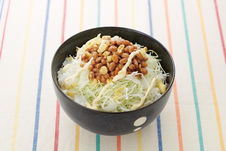 お茶碗にごはんをよそい、せん切りキャベツをのせたら、その上に1.の納豆をかけ、天かすをちらして全体にマヨネーズをかける。