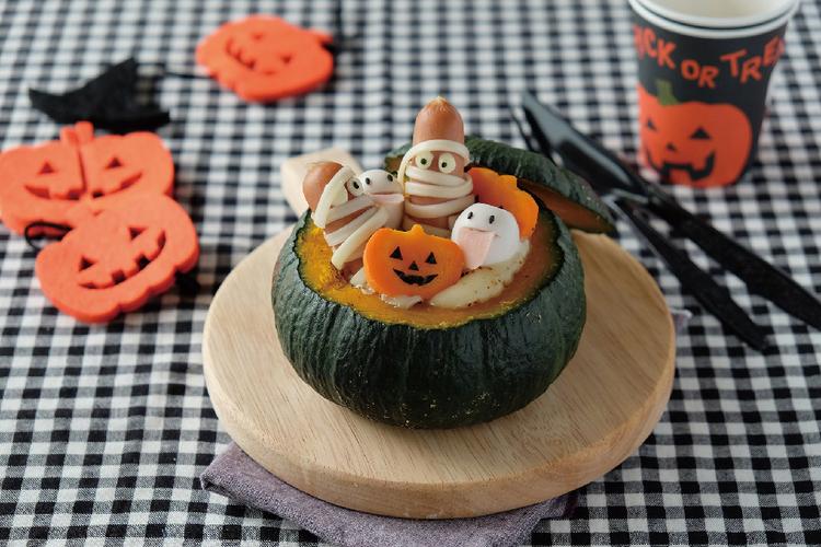 坊ちゃんかぼちゃは丸ごとラップでくるみ、電子レンジ(600W)で5分程度加熱し、上から2〜3cmくらいを切り落とし、種を取り除き器にする。