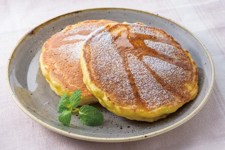 フライパンにサラダ油を薄くひいて中火にかけ、温まったら2.の生地を1/4量ずつ焼く。お皿に盛りつけたら粉糖、メープルシロップをかけ、ミントをそえる。