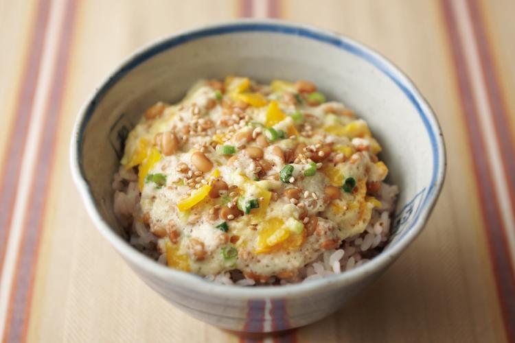 ふんわり納豆とろろ丼 10分 424kcal ※エネルギーは1人分です。 ご飯もの 納豆 材料 (1人分) 五穀ごはん 茶碗1杯分 納豆 1パック 添付のたれ 1袋 大和いも 30g たくあん 20g 万能ねぎ 少々 白ごま 少々 作り方 大和いもは、目の細かいおろし金でおろす。 たくあんは、小さめのいちょう切りにする。 ボウルに納豆をいれ、よく混ぜて添付のたれと1.の大和いも、2.のたくあん、小口切りにした万能ねぎを混ぜる。 茶碗に五穀ごはんを盛り、3.をかけて白ごまを散らす。