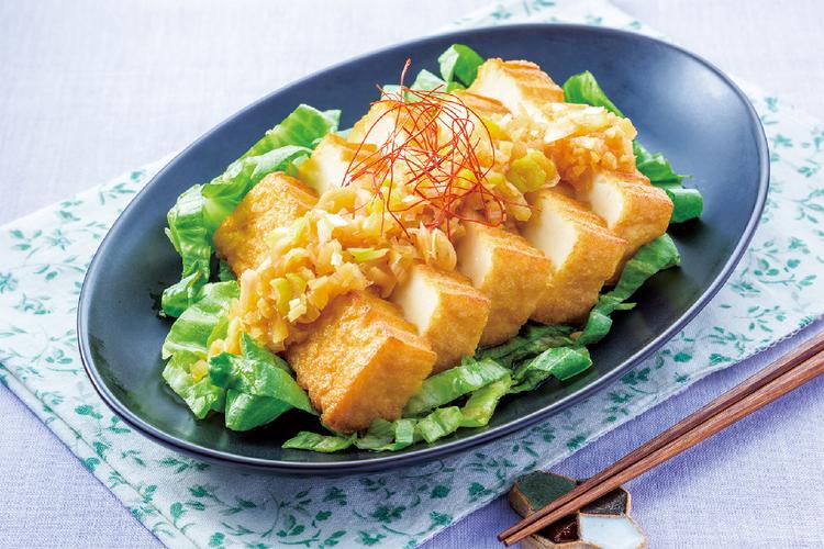 レタスを細切りにして器にのせ、厚揚げを盛り付ける。