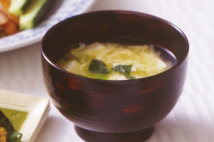 豆腐のすまし汁 15分 57kcal ※エネルギーは1人分です。 汁物・スープ 豆腐 材料 豆腐 1パック(150g) 卵 1個 三ツ葉 4本(4g) だし汁 800ml 酒 大さじ2 塩 小さじ1 うす口しょうゆ 小さじ1 水溶き片栗粉 小さじ2 作り方 豆腐はさいの目に切る。三ツ葉は2センチ長さに切る。 鍋にだし汁と豆腐を入れ、調味料で味をととのえる。 2.に水溶き片栗粉でとろみをつけ、卵を流し入れる。 椀に3.をよそい、三ツ葉を散らす。 ワンポイントアドバイス 卵を入れる前にだし汁に片栗粉を入れてとろみをつけておくと、卵がふわっと広がり、かき玉汁が上手に作れます。