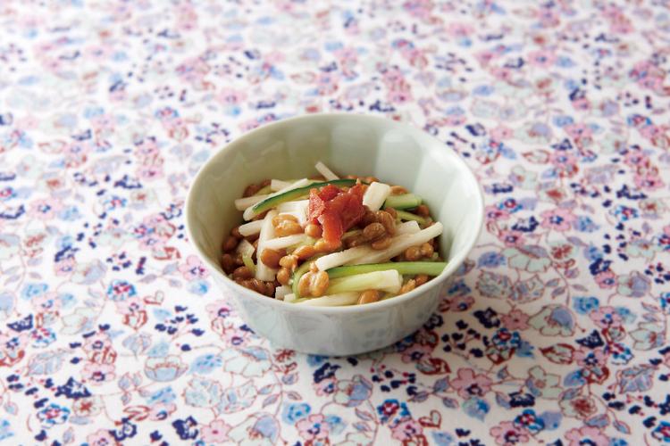 納豆と長いもきゅうりのポン酢和え 和える 副菜 納豆 材料 (1人分) 納豆 1パック 添付のたれ・からし 1袋 長いも 30g きゅうり 1/4本 梅干し 小1粒 ポン酢しょうゆ 大さじ1 ※お好みで刻みのり 作り方 長いもときゅうりは同じ長さのせん切りにする。 ボウルに納豆と添付のたれ・からしを入れ、1.の具材を入れて混ぜ、ポン酢しょうゆで味を調える。 2.を器に盛りつけ、種を取り刻んだ梅干しをのせる。 ※お好みで刻みのりをかける。 ワンポイントアドバイス 長いもは消化もよく、納豆や梅干しとの組み合わせで、夏の暑い時期に食べることでスタミナアップ!