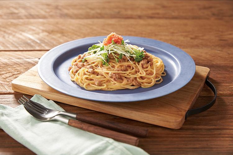 ボウルに納豆、添付のたれ、からし、明太子(2/3量)、しょうゆ、マヨネーズを入れて混ぜ、スパゲッティを加えて絡める。
