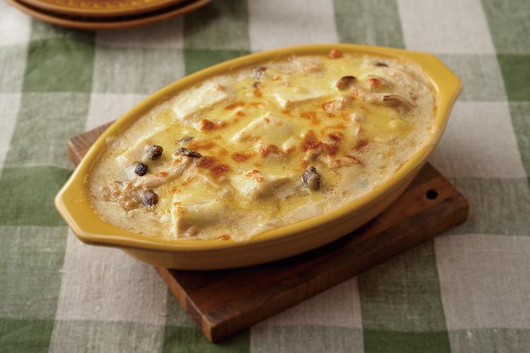 4.の豆腐が温まったら、グラタン皿に入れ、ピザ用チーズをかける。