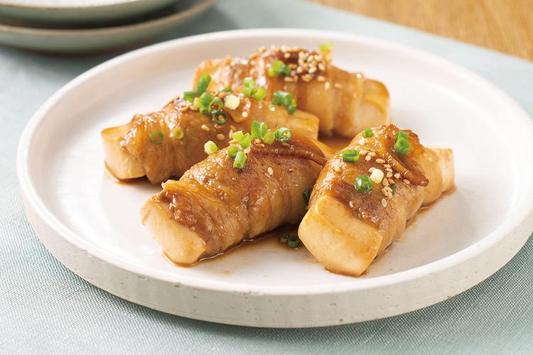 豆腐の肉巻き 10分 356kcal ※エネルギーは1人分です。 焼き・炒め 主菜 豆腐 材料 (2人分) 豆腐 130〜150g 豚ばら薄切り肉 4枚 にんにく(薄切り) 4切れ ごま油 小さじ2 白ごま 適量 青ねぎ(小口切り) 適量 【A】 しょうゆ 小さじ2 みりん 小さじ2 酒 小さじ2 酢 小さじ2 砂糖 小さじ1 作り方 豆腐に豚肉を巻く。 フライパンににんにく、ごま油を入れて弱火で熱し、香りがしてきたら_を入れて、両面焼き色がつくまで焼く。 【A】を加えて、煮絡める。 器に盛り、ごま、青ねぎをかける。 ワンポイントアドバイス 豚肉の巻き終わりを下にしてから焼きましょう。