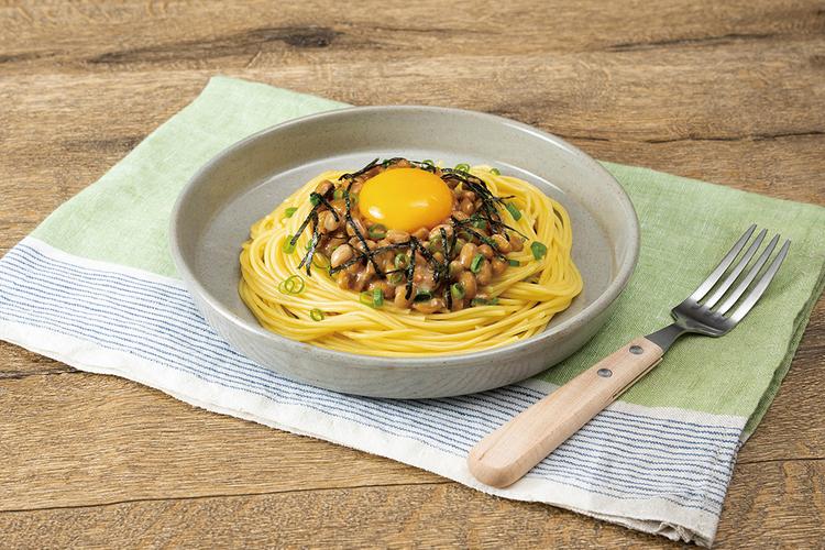 釜玉納豆パスタ 10分 パスタ・グラタン 納豆 材料 (1人分) 納豆 1パック 添付のたれ・からし 1袋 スパゲッティ 100g 【A】 ごま油 小さじ2 塩 ふたつまみ 【トッピング】 卵黄 1個 小ねぎ 適量 刻みのり 適量 作り方 鍋にお湯を沸かして塩(分量外)、スパゲティを入れ、パッケージの表記通りにゆでたらお湯を切る。 ボウルに納豆、添付のタレ、添付のからしを入れ、混ぜる。 別のボウルに1、【A】を入れ全体に味がなじむようによく和える。 お皿に盛り付け、2、トッピングの材料をのせる。