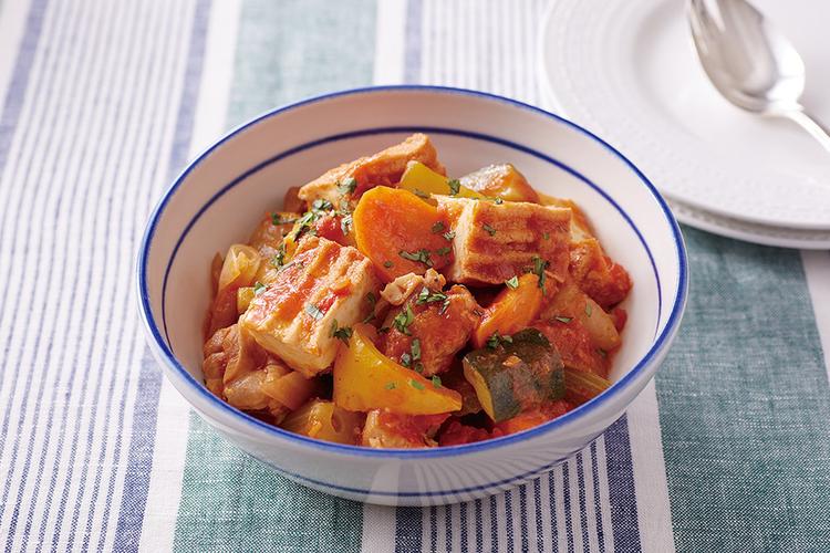 5.を4.にいれ、トマト缶と絹厚揚げをいれ、塩とこしょうをし、蓋をして弱火で15分くらい蒸し煮にする。