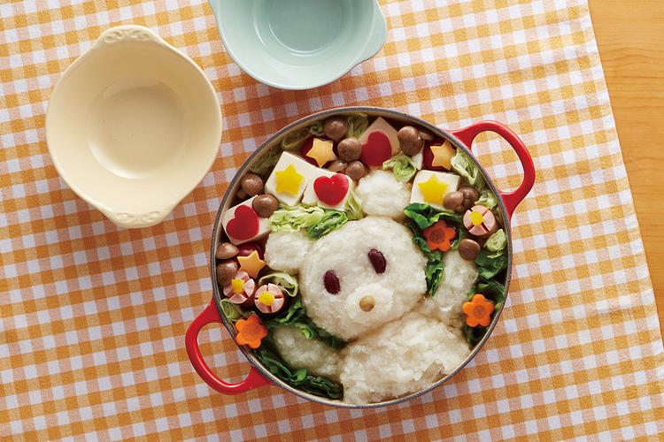残りのウインナーとキャベツを食べやすい大きさに切って鍋に敷き詰め、上に水気をしぼった大根おろしでくまの形を作る。レッドキドニーの目、ひよこ豆の鼻をつける。周りに豆腐、花の形のウインナー、ぶなしめじ、ミニトマト、抜き型(星、ハートなど)で抜いたパプリカ、にんじん、スライスチーズを飾る。
