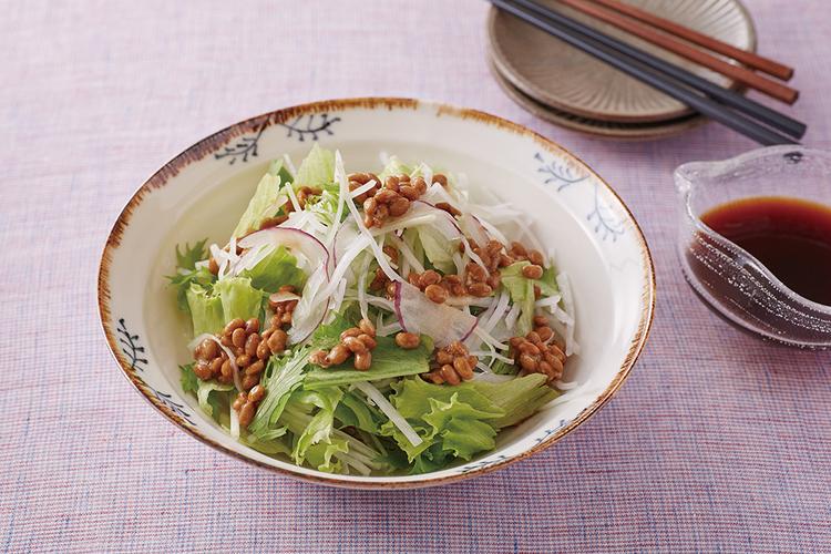 和風納豆サラダ 和える サラダ 納豆 材料 (2人分) 納豆 1パック 添付のたれ 1袋 水菜 1株 大根 5cm 紫玉ねぎ 1/4個 レタス 1枚 和風ドレッシング(市販品) 60ml 作り方 水菜は4cm長さに切り水にさらす。大根はせん切り、紫玉ねぎは薄切りにし水にさらす。レタスはひと口大に切り、水にさらす。 大きめなボウルに納豆、添付のたれを入れ混ぜ、1.の水気を切りボウルに加え和える。 器に盛りつけ、好みの和風ドレッシングをかける。 ワンポイントアドバイス 水菜や大根、紫玉ねぎが含む成分と納豆で、健康生活を応援します!