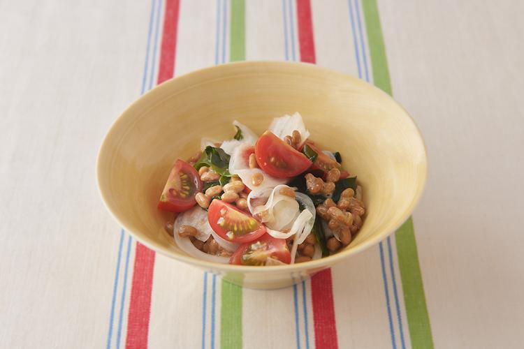 納豆海藻サラダ 和える サラダ 納豆 材料 (1人分) 納豆 1パック 添付のたれ・からし 1袋 乾燥わかめ 1g ミニトマト 2個 新玉ねぎ 40g ※お好みでドレッシング 作り方 乾燥わかめは水で戻す。ミニトマトはヘタを取り、4等分に切る。 玉ねぎはうす切りにし、水にサッとさらし、水をきる。 ボウルに納豆、添付のたれ・からしを混ぜ合わせる。 3.にわかめと玉ねぎを混ぜ、器によそい、ミニトマトを飾る。 ※お好みでドレッシングをかける。 ワンポイントアドバイス ビタミン・ミネラルなどが豊富な海の食材わかめと納豆を一緒に摂って、カラダの中から健康になりましょう!