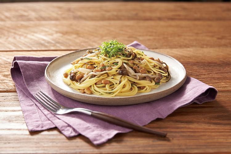 スパゲッティの茹であがり1分前にしめじを加え、茹で上がったら一緒にザルにあげて水気をきり、熱いうちに3.のボウルでバターが溶けるまで混ぜ合わせる。