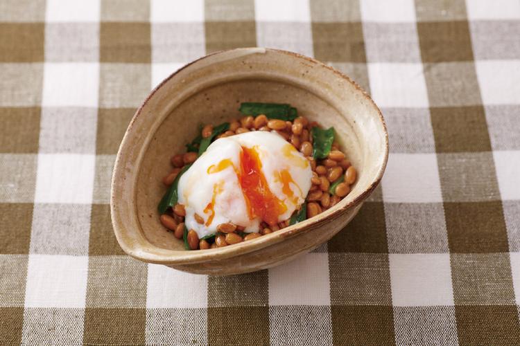 ニラ玉納豆 和える 副菜 納豆 材料 (1人分) 納豆 1パック 添付のたれ 1袋 ニラ 1/8把(12g) ラー油 小さじ1/2 温泉卵 1個 作り方 ニラは3cm長さに切って、サッと塩ゆでし、ザルに上げ水気を切る。 ボウルに納豆、添付のたれ、1.を加え混ぜ合わせる。 器に盛りつけ、ラー油をまわしかけ、中央に温泉卵を落とす。 ワンポイントアドバイス ニラに含まれるアリシンは納豆のビタミンB1の吸収を高めます!