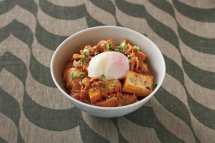 フライパンを熱しごま油を入れ、豚バラ肉、絹厚揚げの順に炒める。火が通ったらキムチを入れ炒め合わせ、醤油で味をととのえる。