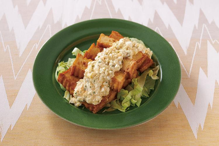 5.のフライパンの油をふき取り、火を止めて甘酢たれをからめる。レタスとともに盛り付け、タルタルソースをかける。