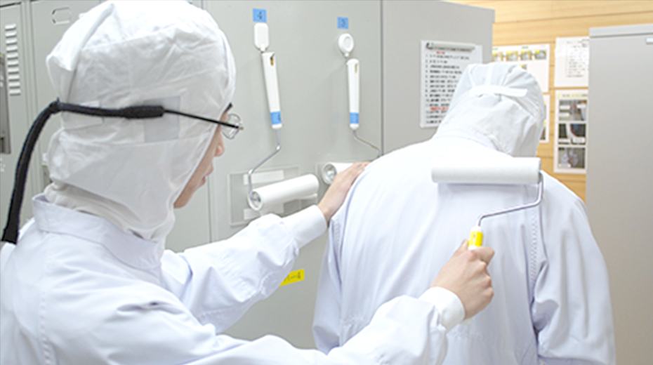 工場の入口は一箇所に限定し、しっかりとクリーニングされた専用の白衣、帽子を着用して粘着ローラーで白衣についた髪の毛、埃を取り除いています。また、入口では工場内専用の靴に履き替え、エアーシャワー室を通ることで外からの異物の持込を防止しています。資材などの搬入口は高速電動シャッターを取り付け、素早く開閉を行っています。またその部屋を暗室にし内部に冷房を効かせることで外からの虫の侵入を防止しています。