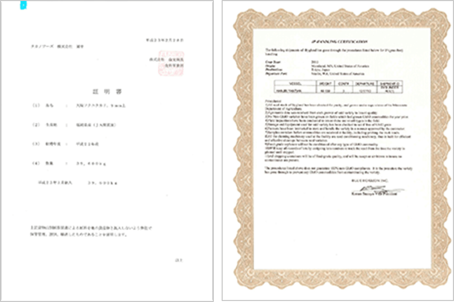 タカノフーズの購入大豆は、日本国内の製造工場まで生産・流通・加工の各段階で、GMO大豆や他の穀物と混ざらないように分別管理され、そのことが書類により証明されています。