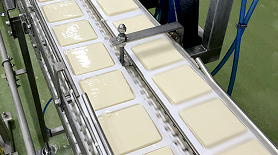 高品質でおいしいおかめ豆腐をお届けするために、過剰な加熱殺菌をしなくても安全が確保できるように取り組んでいます。殺菌するための過剰な加熱は風味の低下につながると考えるからです。そのためには、日常の生産ラインの洗浄と衛生管理の徹底が絶対条件。毎日、およそ4時間もの時間をかけて生産ラインを分解し、洗浄を行っており、このノウハウは長年に渡り蓄積し続けています。